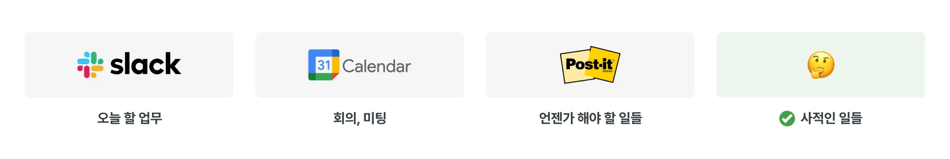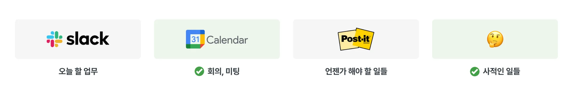 쏟아지는 업무 속에서 기억력에만 의존해 할 일을 관리하고 있었다면, 상술한 툴을 활용해 가장 중요한 일에만 집중할 수 있는 환경을 만들어보는 걸 추천한다.