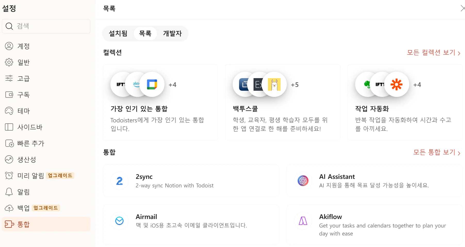 설정 > 통합 > 목록