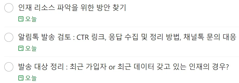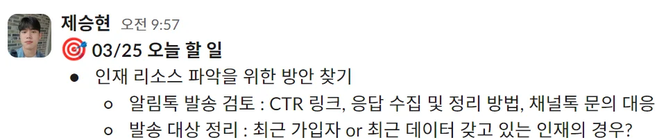 • 오늘 할 업무 리스트는 매일 아침, 슬랙 메신저의 데일리 스크럼 채널에 업로드한다.